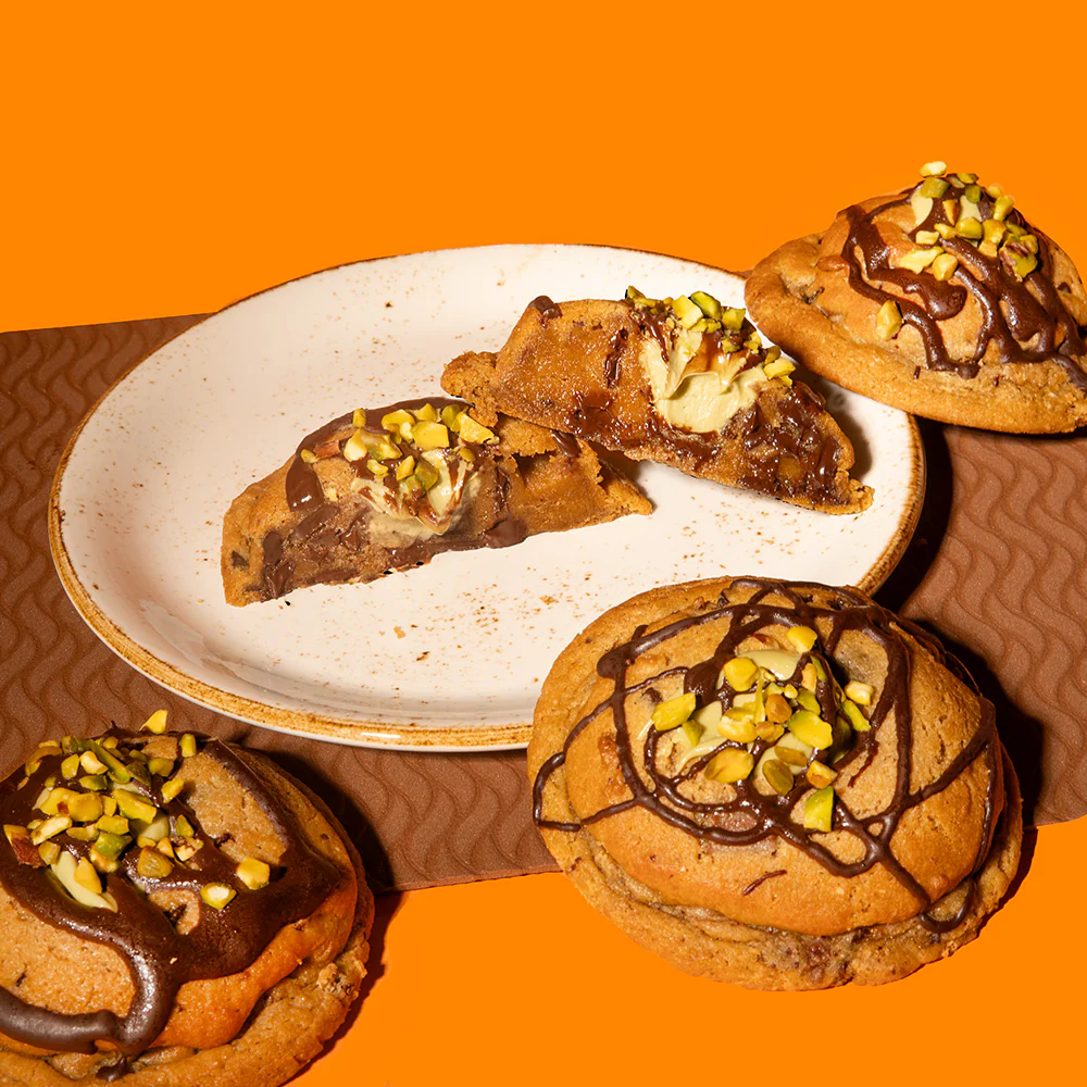 Indulge in our Pistachio Belgian Cookies, now available in a convenient 4-pack! These premium pistachio cookies are filled with creamy pistachio goodness, Belgian chocolate chips, and a luscious pistachio & Nutella filling. Topped with diced pistachios and a chocolate drizzle, they offer the perfect balance of flavours and crunch.